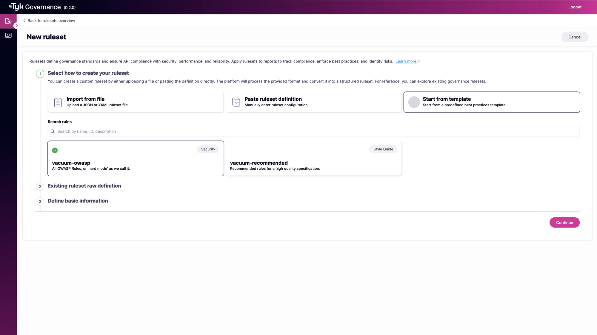 - Choose how to create your ruleset (import from file, paste definition, or start from template)