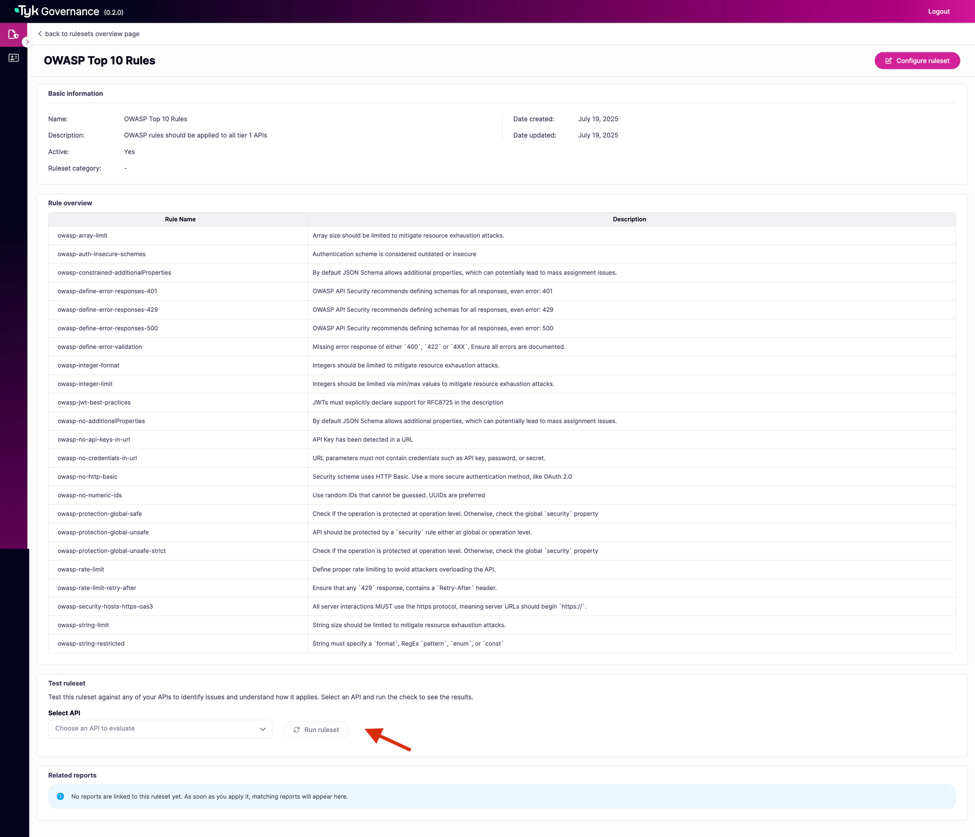 After creating your ruleset, you’ll want to test it against your APIs to ensure it correctly identifies compliance issues. You can test a ruleset through the Governance UI: